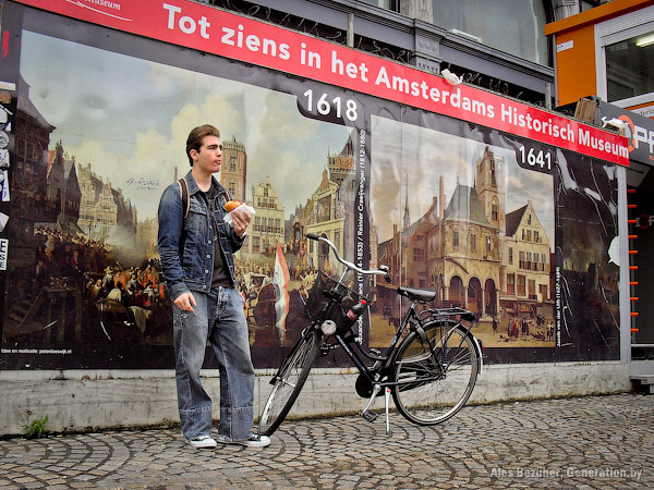 У нашых паважаных шматнацыянальных амстэрдамскіх гаспадароў пад вокнамі выявіўся цэлы роварны парк: іржавыя і горныя, прыгожыя і паламаныя — усе прыматаныя да ліхтароў і платоў ровары. Выбірай любы. Выбіраем, едзем, прыяжджаем. І, які жах! Панічны страх, што менавіта нашы ровары, адзін другога каштуе, скрадуць і зьвязуць на белым фургоне, што так дарэчы прыпаркаваўся ля кавашопу Siberie.