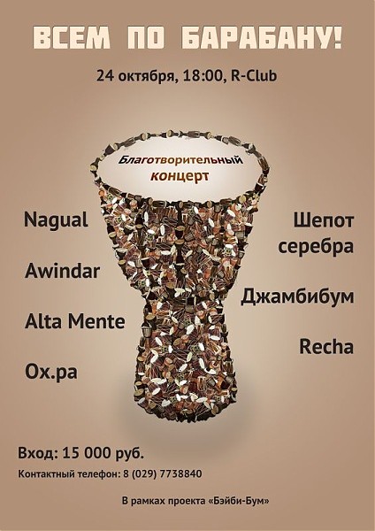 24 кастрычніка ў клюбе «R-club» адбудзецца дабрачынны канцэрт «Усім па барабану!» А ўсе сродкі, сабраныя па выніку імпрэзы, пойдуць на пакупку барабанаў для дзяцей зь дзіцячага дому і дому-інтэрнату для дзяцей з асаблівасьцямі псыхафізычнага разьвіцьця.