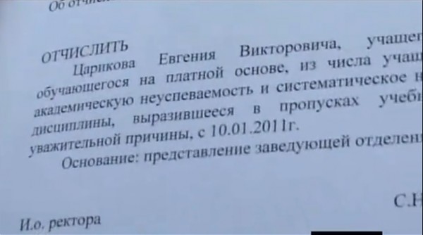 Загад аб адлічэньні студэнта Вышэйшага радыётэхнічнага каледжу Яўгена Царыкава. Хлопец удзельнічаў у партэстах 19 сьнежня. Кадар зь сюжэту НТВ