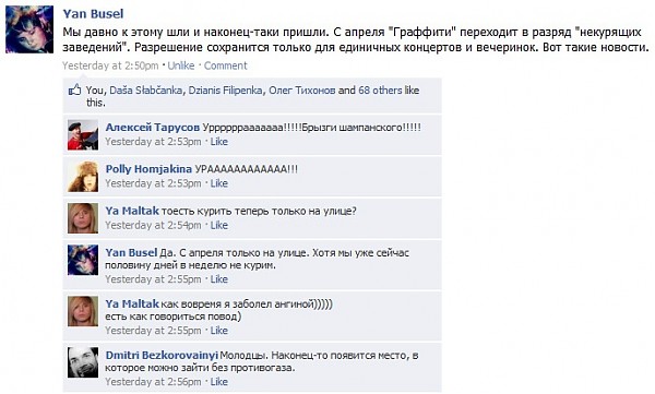 «Мы даўна ішлі да гэтага і нарэшце прыйшлі. З красавіка „Графіці“ пераходзіць у катэгорыю „устаноў, дзе ня паляць“. Дазвол захаваецца толькі для асобных канцэртаў і вечарын», — напісаў у сваім акаўнце ў сацыяльнай сетцы Facebook адзін з уладальнікаў клюбу Ян Бусел.