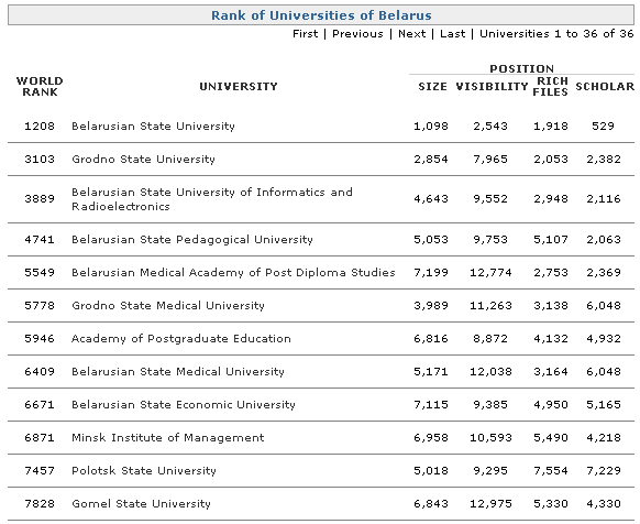 Апошнія некалькі гадоў улады імкнуцца літаральна «ўпіхнуць» беларускія ўнівэрсытэты хоць у нейкі сусьветны рэйтынг. Ад таго ўзьняцьцё БДУ у гішпанскім сьпісе лепшых было гучна адсьвяткаванае прапагандай. Выглядае, што пакуль беларускім ВНУ прыйдзецца абмежавацца выключна высьвятленьнем адносінаў у нацыянальным рэйтынгу, што неўзабаве зьявіцца ў нашай краіне.