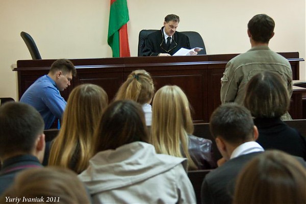 Як паведамляе сайт ГрДУ, студэнтам ужо паказалі два суды: на адным зь іх (на фота) разглядалася справа сына, які падчас сумеснай п’янкі па неасьцярожнасьці забіў маці. Студэнты моўчкі назіралі за працэсам.