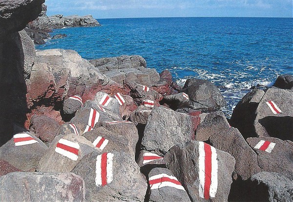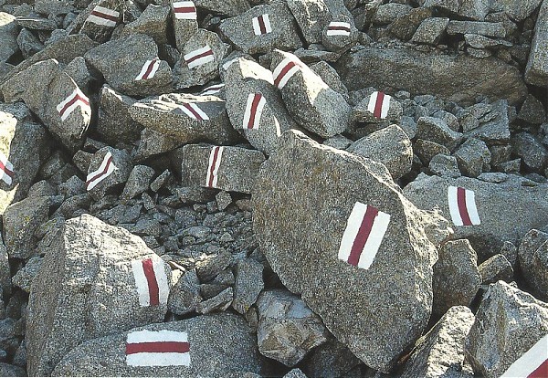Бел-чырвона-белымі палосамі ў гарах традыцыйна абазначаюць сьцежкі для вандроўнікаў. У Беларусі горных сьцежак няма, але нядаўна падобныя знакамі беларускія раварысты вырашылі пазначыць маршруты ў лясах.