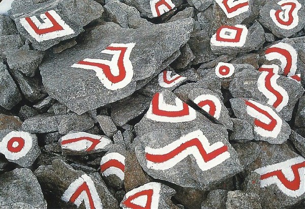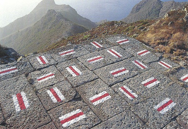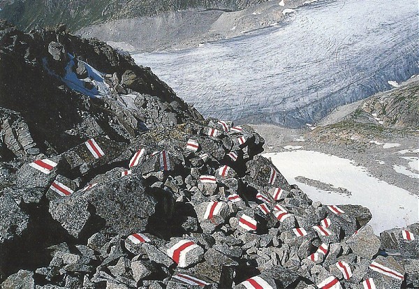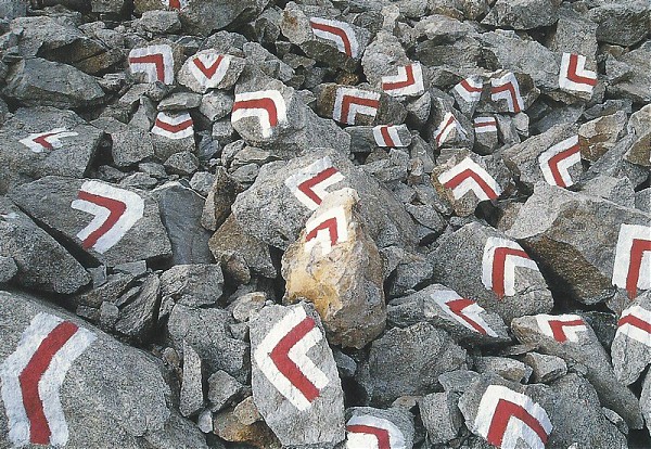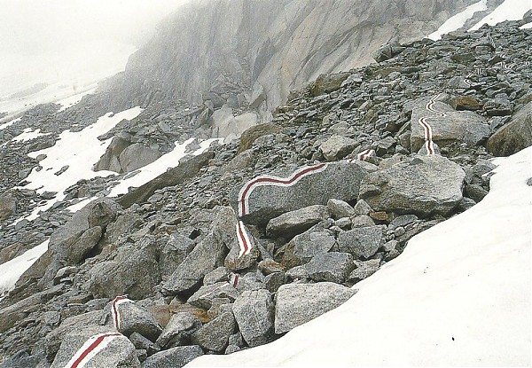 Швэйцарскі фатограф робіць мастацкія здымкі бел-чырвона-белых пазнакаў горных сьцежак.