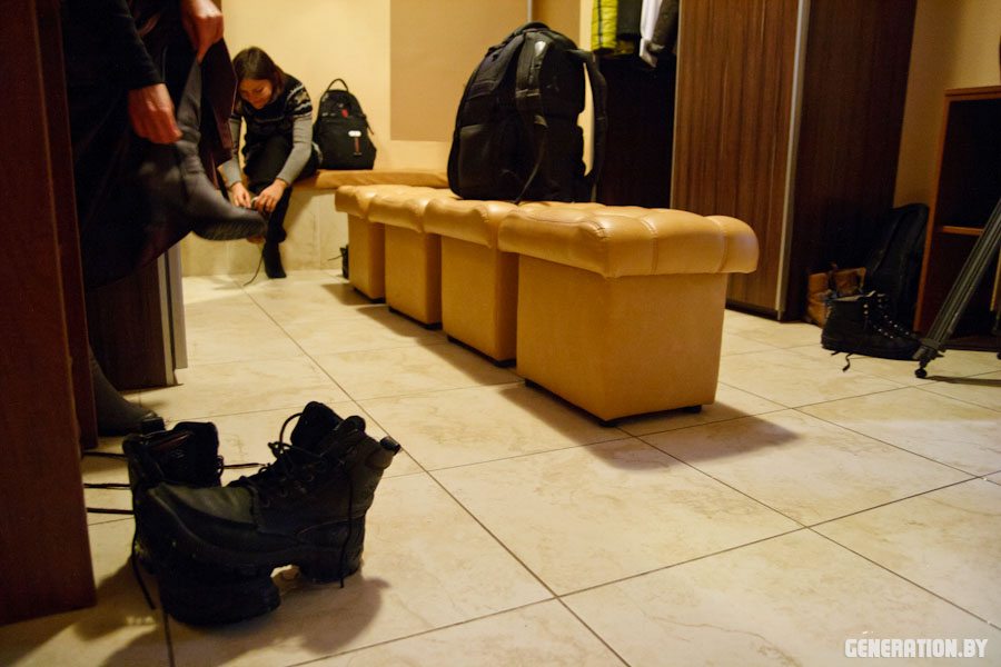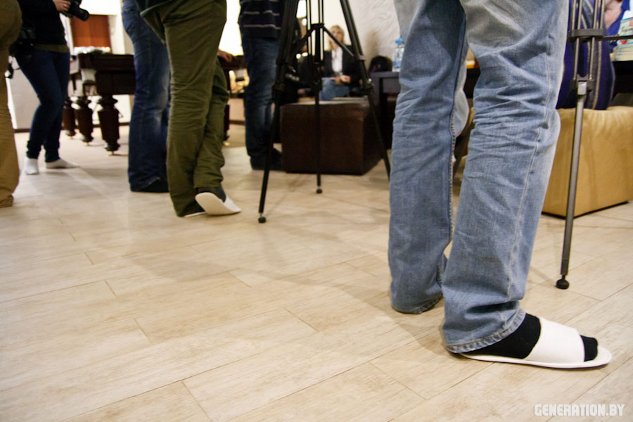 Журналісты крыху разгубіліся праз неабходнасць здымаць абутак на прэс-канферэнцыі.