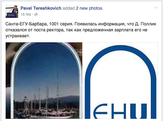 «Санта-ЕГУ-Барбара, 1001 серыя. З'явілася інфармацыя, што Д. Полік адмовіўся ад паста рэктара, бо прапанаваны заробак яго не задавальняе», – напісаў учора ў Facebook былы кіраўнік Сената ЕГУ Павел Церашковіч.